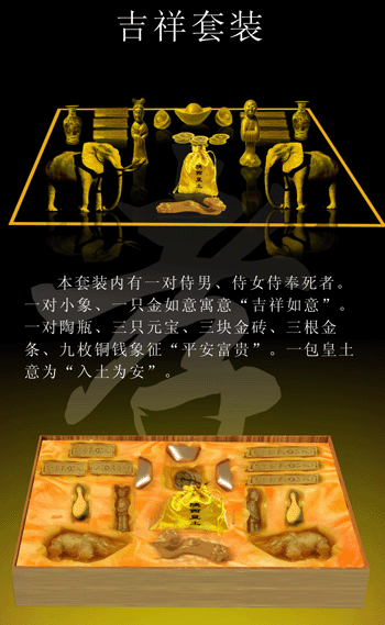 西安黄土工艺品有限公司 www.shanxihuangtu.com 特色陪葬品吉祥套装,此套装寓意为吉祥如意,让你的亲人在吉祥如意氛围中安详的离开,让你为亲人尽孝道。